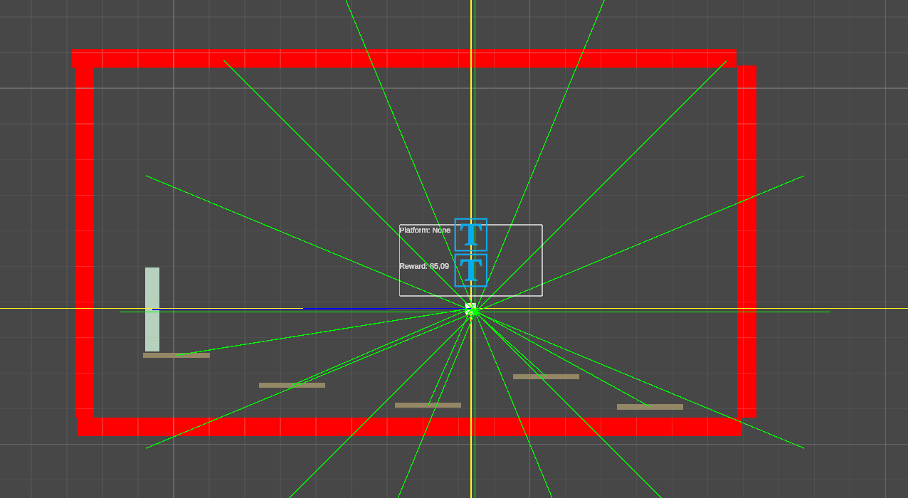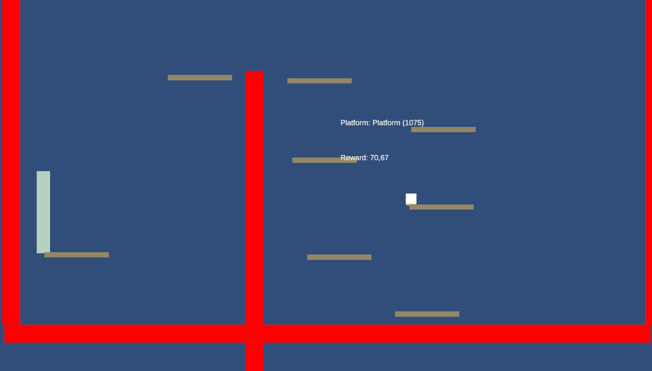 L'IA utilise l'apprentissage par renforcement. L'agent apprend en interagissant avec un environnement. Il reçoit des récompenses positives lorsqu'il fait une bonne action et des pénalités lorsqu'il échoue. Son but est d'atteindre la fin du niveau. Une vingtaine de niveaux différents ont été créés pour cette experience